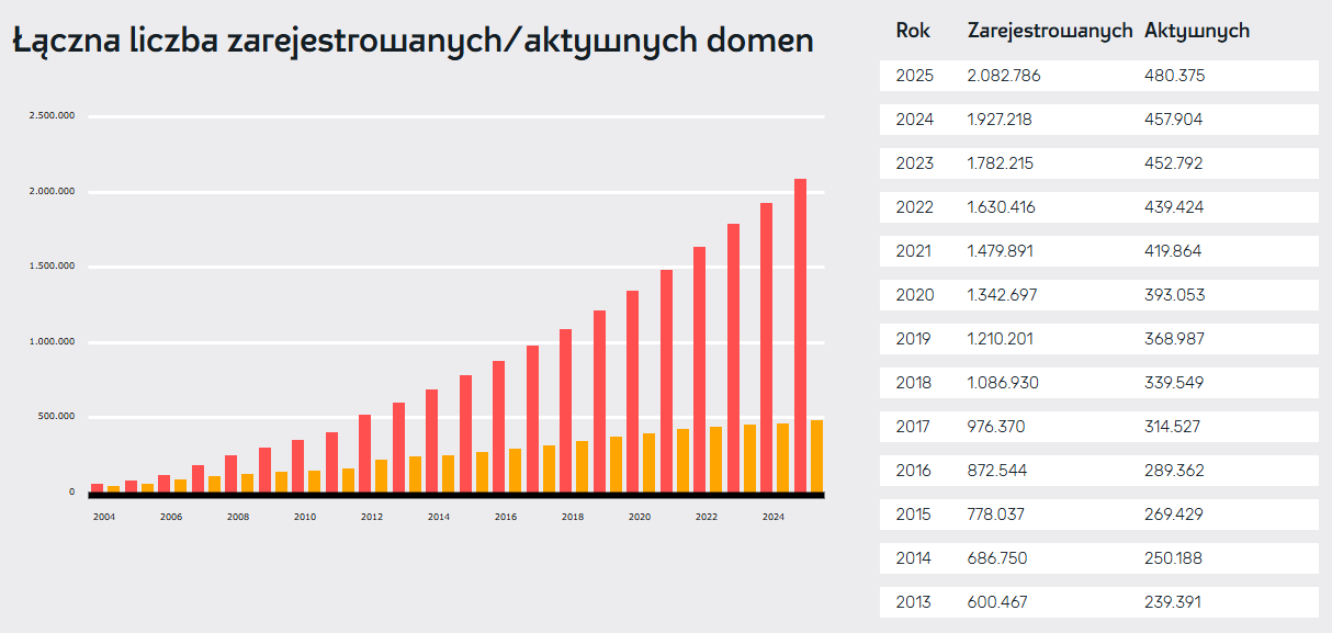 - Współczynnik odnowień na poziomie 81% – wysoki retention rate oznacza, że użytkownicy są zadowoleni ze swoich domen i konsekwentnie je utrzymują. To jeden z najlepszych wskaźników stabilności rynku domenowego.